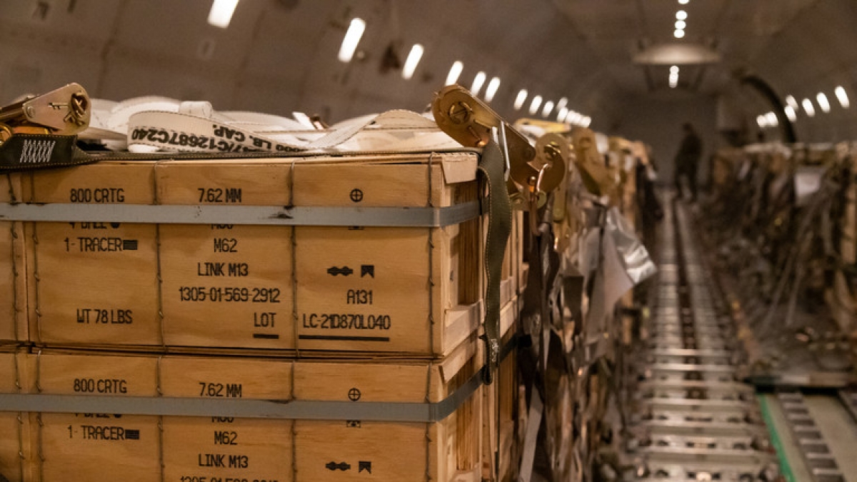 Các thùng đựng vũ khí, đạn dược được chất lên máy bay tại căn cứ không quân Dover, Delaware, Mỹ, chuẩn bị đưa tới Ukraine ngày 30/1/2022. Ảnh: AFP
